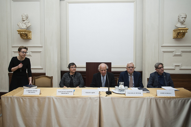 A könyvbemutató megnyitásaként Gárdos-Orosz Fruzsina, az MTA TK Jogtudományi Intézetének igazgatója köszöntötte a kötet szerkesztőjét, a szerzőket, a hozzászólásra felkért szakértőket és a megjelent vendégeket. Nyitóbeszédében röviden bemutatta a kötet keletkezésének történetét, az enciklopédia szerepének fontosságát, kiemelve annak egyedi jellegét a hazai jogtudományi szakirodalomban. Hangsúlyozta, mennyire hasznos a kötet az oktatásban és a kutatásban, széles körűek a felhasználási lehetőségei az egyetemeken és a gyakorló jogászok mindennapi munkájában.