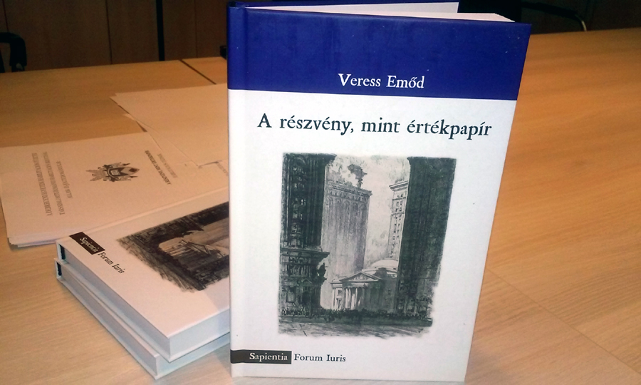 Intézetünkben június 21-én került sor Veress Emőd A részvény mint értékpapír című, a Sapientia Erdélyi Magyar Tudományegyetem jog szakának megbízásából Kolozsvárott kiadott könyve bemutatójára. A kötetből az olvasó áttekintést nyerhet a részvénytársaságok történetének gyökereiről, közöttük olyan érdekességekről, mint a részvénytársaság előképének tekintett XIII. századi, Genovában működő hitelezői egyesületről, valamint a Brit és a Holland Kelet-indiai Társaság működéséről. A szerző művében elemzi a részvényfajták és részvénykategóriák jogi sajátosságait, valamint a részvényforgalom jogi kategóriáit is.